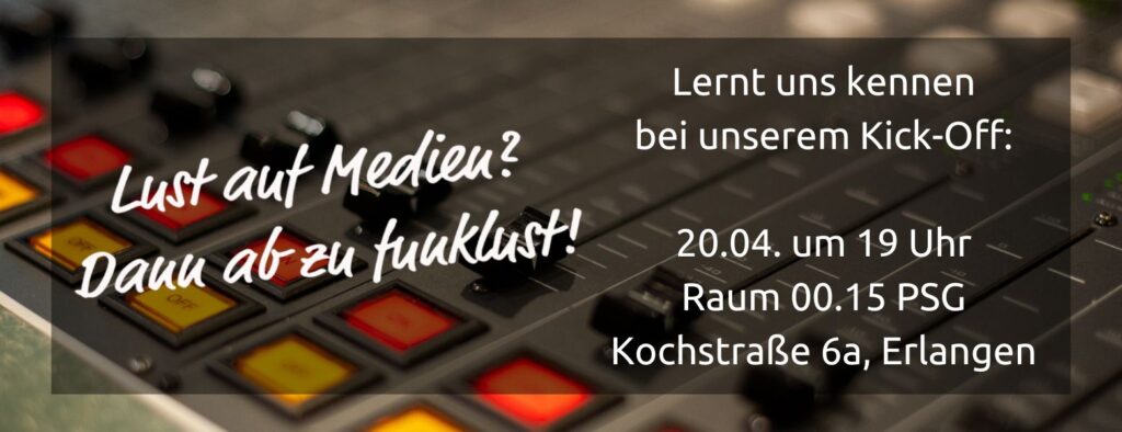 Dann seid ihr bei uns genau richtig! Egal ob Radio- oder Videoreportagen, Bandinterviews, Berichte über die Erlanger Bergkirchweih, Webartikel oder Arbeit mit der Elektronik – bei uns könnt ihr euch kreativ austoben und professionelle Audio- und Videotechnik kennenlernen. Mehr zu uns erfahrt ihr bei unserem Kick-Off am 20.04.
